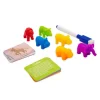 Set de 60 piezas de plásticos resistentes con diseño animales como caballos, vacas, ovejas , leones, elefantes, etc. en 6 colores. Cada pieza mide 4 x 2 x 2 cm aproximadamente, incluye 6 tarjetas con patrones de 5 x 4,5 cm. 1 plumón-borrador, 16 pizarras 21 x 15 cm. Presentación caja contenedora de mica transparente con asa, de medidas 21 x 15 x 5 cm.