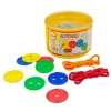 Botones con cordones, son útiles para ejercitar la habilidad manual y también para actividades lógico-matemáticas. Con ellos los niños ensartan, cosen, apilan, agrupan, hacen series, clasifican, etc. Contenido: 48 botones de colores medidas 40 mm. de diámetro. 2 cordones de colores medidas 100 mm. Presentación en pote de plástico medidas 73 x 107 mm. de diámetro.
