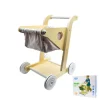 Carro de supermercado de madera natural con canastillo de género, con medidas 46 x 28 x 30 cm. Permite a través del juego desarrollar sociabilidad, motricidad e imaginación. Presentación caja de cartón.