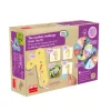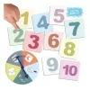 Juego El Reto de los Números del 1 al 10. Set contiene 20 cartas de números distintas texturas y cortes medidas 6,5 x 6,5 cm. por lado. 2 discos para ruleta de 12 cm. de diámetro, 10 números perforados de 8 x 7 cm. Todos fabricados en cartón duro. Además de 10 cordones de colores y 2 flechas de plástico para la ruleta. Presentación en caja de cartón medidas 20 x 6,5 x 13 cm.