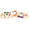 Juego tren de la ciudad, material madera cepillada pintada con diferentes colores. El kit contiene 45 componentes: 24 pistas, 2 trenes cada uno con 2 vagones, 3 autos, 5 árboles, 2 edificios, 3 señales de tránsito, 1 puente y 2 figuras de personas. Desarrolla motricidad, imaginación, creatividad, juego de roles, habilidades sociales. Fortalece el trabajo en equipo y lenguaje oral.