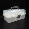 ÚLTIMAS UNIDADESMaleta plástica transparente, medidas 32 x 20 x 15 cm, con 2 niveles desplegables y varias divisiones. Incluye cierre frontal y asa superior para transporte. Diseñada para transportar materiales y herramientas de arte.