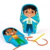 ÚLTIMAS UNIDADESSet compuesto por 6 siluetas, medidas 18 x 12 cm, 6 trajes, medidas 11 x 6 cm, 6 cordones, medidas 98 cm, 6 agujas de plástico de 12 cm y 1 folleto. Desarrolla coordinación visomotriz, además de motivar sentimientos de respeto y afecto hacia los demás. Presentación balde de plástico con tapa y asa para tomar, medidas 12 x 21 cm.