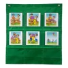 Panel de lona color verde con medidas 50 x 46 cm, incluye 9 bolsillos 6 transparentes y 3 verdes para guardar las tarjetas, 36 cartas de cartulina laminada con medida 12,5 x 12,5 cm, contienen ilustraciones a color para la construcción de diferentes secuencias y dos argollas para colgarlo en el aula, 6 historias con 6 escenas cada una. Desarrolla lenguaje oral, razonamiento lógico, atención, seriación y motricidad.