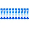 ÚLTIMAS UNIDADESSet de 10 Relojes de arena de 1 minuto, diseñado con una base redonda de 3cm, en la parte superior el reloj tiene el tiempo en relieve y los granos en color azul. Mide de altura 9cm. Ideal para competencias y juegos.