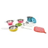 ÚLTIMAS UNIDADESSet de vajilla compuesto por 11 piezas acero inoxidable que incluye: 1 olla recta con tapa metálica, color calipso metálico, medidas 14 cm x 7 cm, 1 paellera metálica rosada medidas 14 x 3,5 cm, 1 sarten metálico amarillo medidas 17 x 3 cm, 1 tapa metálica verde, medidas 9 x 2 cm, 1 colador metálico rosado medidas 13 x 5 cm, 1 espumadero metálico, medidas 5 x 14 cm, 1 espátula metálica medidas 3 x 14 cm, 1 cuchara metálica 4 x 13 cm, 1 cuchara para pastas metálica, medidas 2 x 13 cm y 1 tomador de olla de género medidas 11 x 11 cm. Desarrolla la convivencia escolar, el trabajo colectivo, habilidades sociales y juego de roles. Presentación caja de cartón medidas 36,5 x 21 x 10,5 cm.