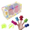 Títeres para dedos. Set contiene 5 títeres con figuras de animales. Medias aproximadas 6 x 3 x 6 cm. . Todos fabricados en goma blanda y con textura exterior soft aterciopelada. Presentación en caja de cartón medidas 16,5 x 9,2 x 7,5 cm.