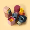 Set de 7 cubos apilables, en distintos tamaños. Fabricados en goma flexible y suave. Medidas desde 7,5 x7,5 cm. hasta 3 x 3 cm. Presentación en caja de cartón con ventana medidas 8 x 8 cm.